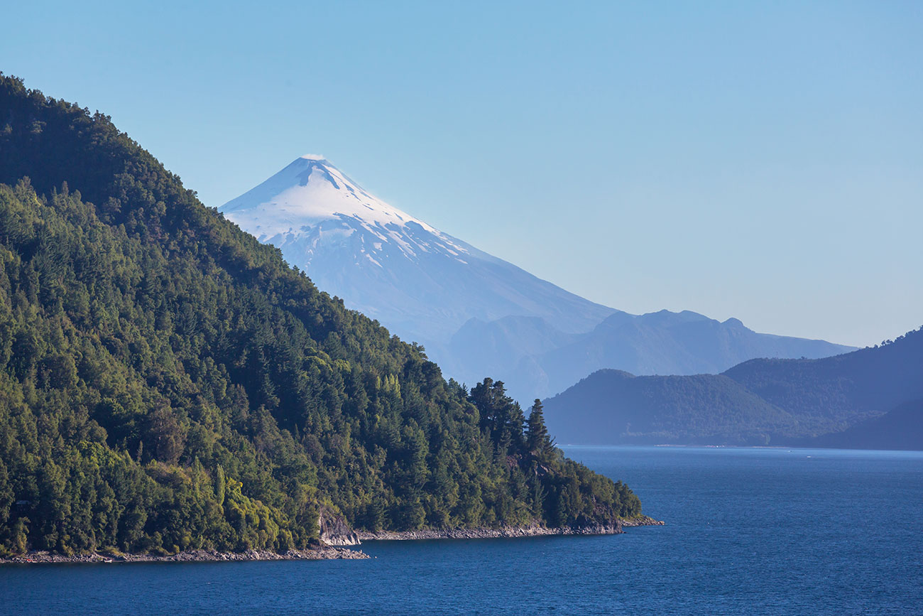 A boat ride takes us across the lake into Chile, with the majestic Osorno Volcano rising ahead. Upon arrival in Petrohué, we check in to a cozy lakeside lodge.